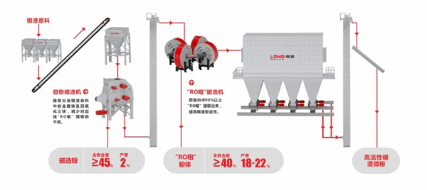 沈陽隆基在鋼渣微粉“RO相”提取中取得技術(shù)突破,解決了鋼渣微粉建材化利用存在配比低、活性低等問題。鋼渣微粉全鐵含量由18%降低至8-10%,鋼渣復(fù)合粉體達(dá)到S95級甚至更高,“RO相”產(chǎn)率18-22%,全鐵含量≥40%,磁選粉產(chǎn)率2%,全鐵含量≥45%。